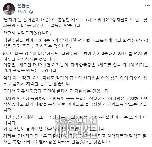 자유한국당 윤한홍 의원이 2일 자신이 운영하는 페이스북을 통해 여야 4당의 패스트트랙 지정 관련 '선거제도 개혁법'에 간단히 설명을 게재 했다.