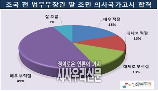 여론조사 전문기관인 미디어리서치가 1월 20일 발표한 여론조사에서'조국 전 법무부 장관 딸 조민씨 의사 국가고시 합격'에 대한 질문과 관련해 적절 31.4% 〈 부적절 61.4%로 부정적인 반응이 긍정적인 반응보다 2배나 높았다. 잘 모름 7.2%로 조사됐다.