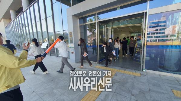 군청 직원을 대상으로 누전에 따른 건물에 정전과 화재가 발생한 상황을 가정해 ▲청사 내 방송을 통한 상황 전파 ▲대피 유도 ▲화재 시 국민행동요령 교육 순으로 진행됐다.
