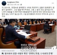 [e시사우리신문] 진중권 전 동양대 교수는  지난  일 페이스북을 통해 與, 법사위서 검찰-사법부 맹공 "한명숙 판결, 수사과정 문제"라는 기사제목을 링크한 후"나머지 형법을 다 폐지하면 죄형법정주의 원칙에 따라 대한민국은 아예 범죄 없는 나라가 될 겁니다"라며"그걸 문대통령의 최대의 치적으로 삼으시구요"라고 비난했다.   ▲진중권 페이스북     ©e...